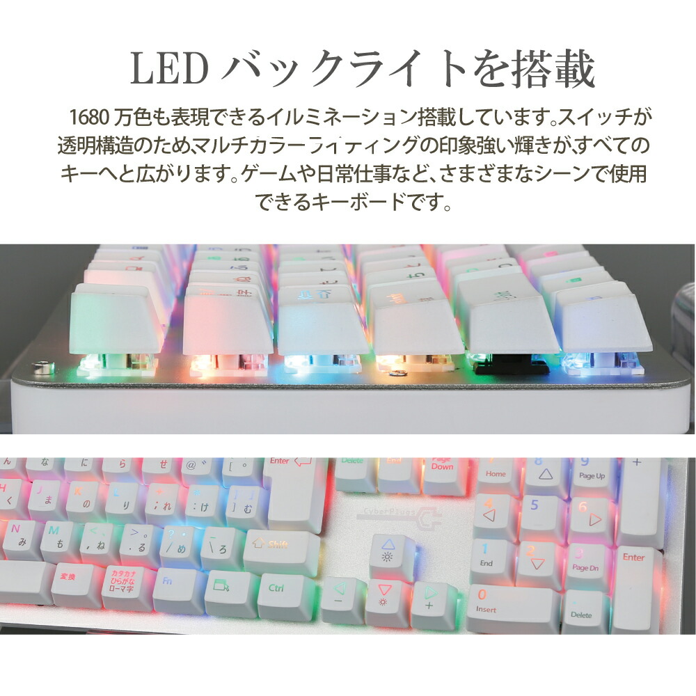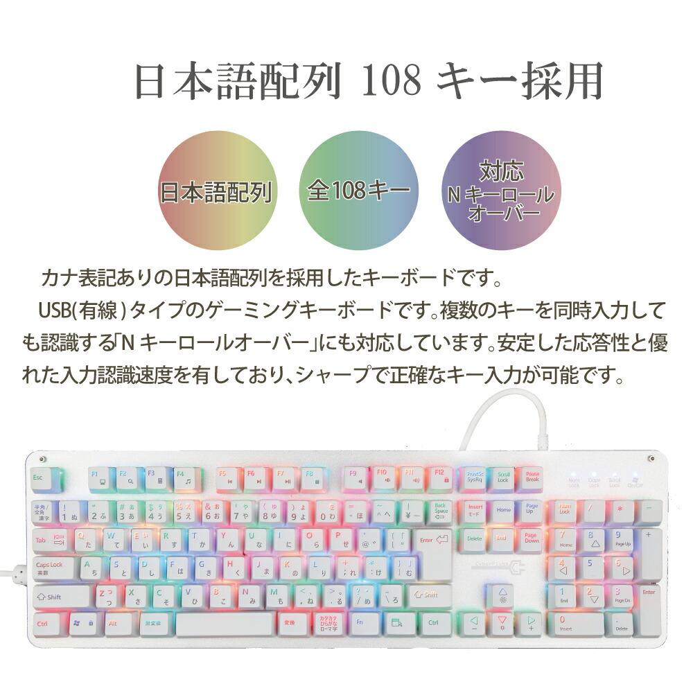 ゲーミングキーボード 白 茶軸 JIS配列 日本語配列 キーボード メカニカルキーボード ホワイト 有線 20種類LED色変 全キーLED色独立設定可能 フルサイズ 108キー防衝突 全キー自由設定 仕事PC 自宅ゲーム Windows Mac OS対応 プレゼント ギフト