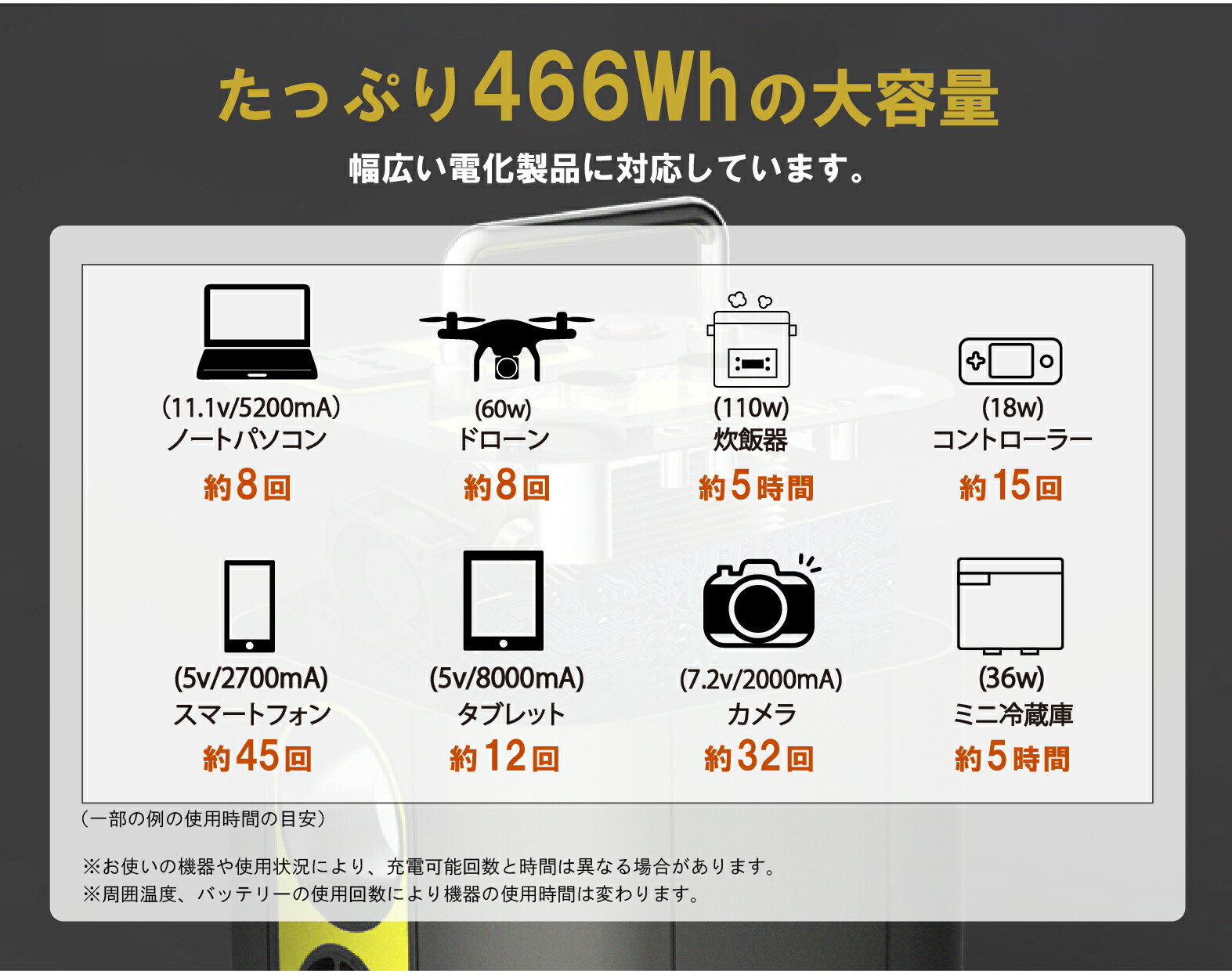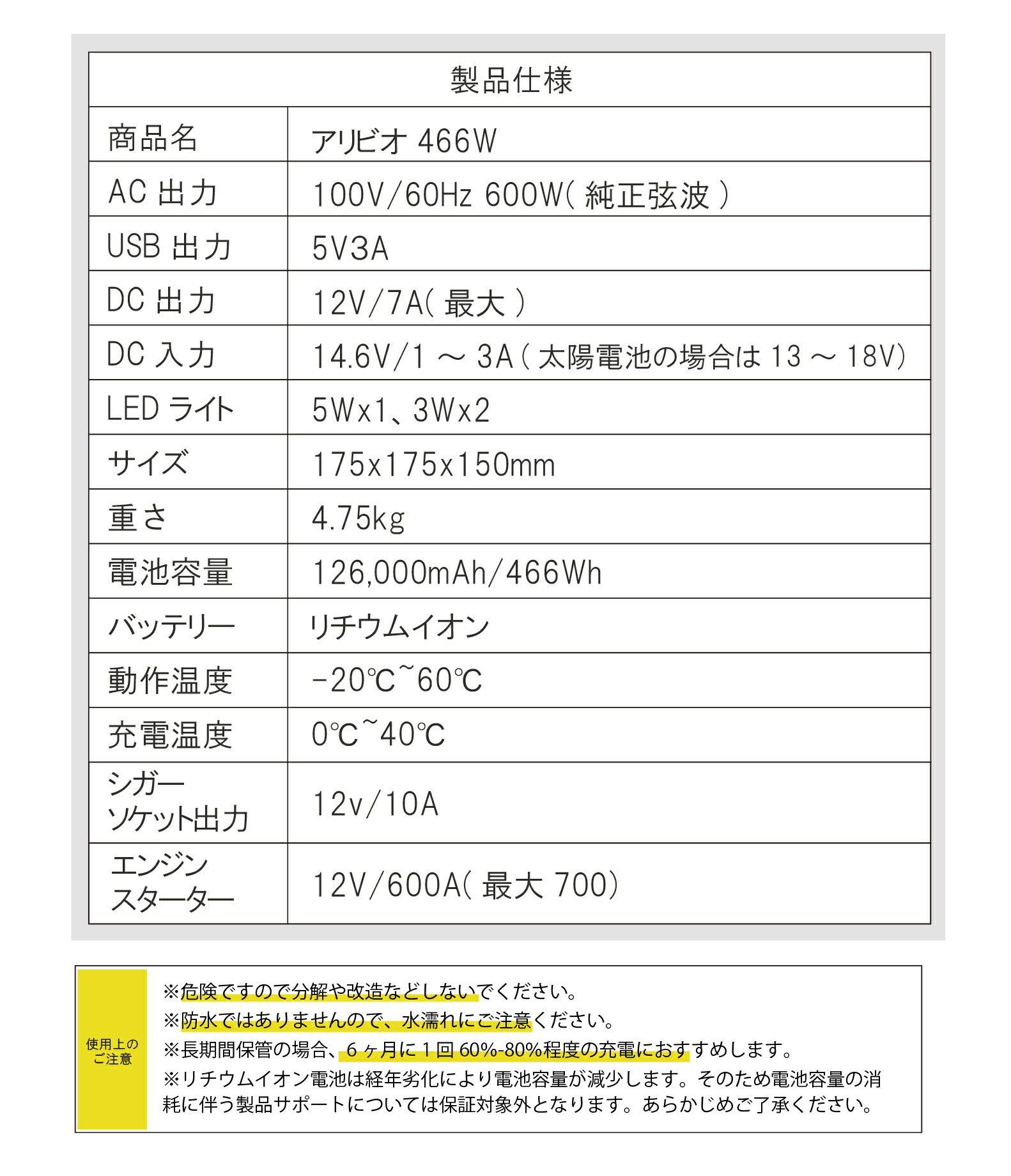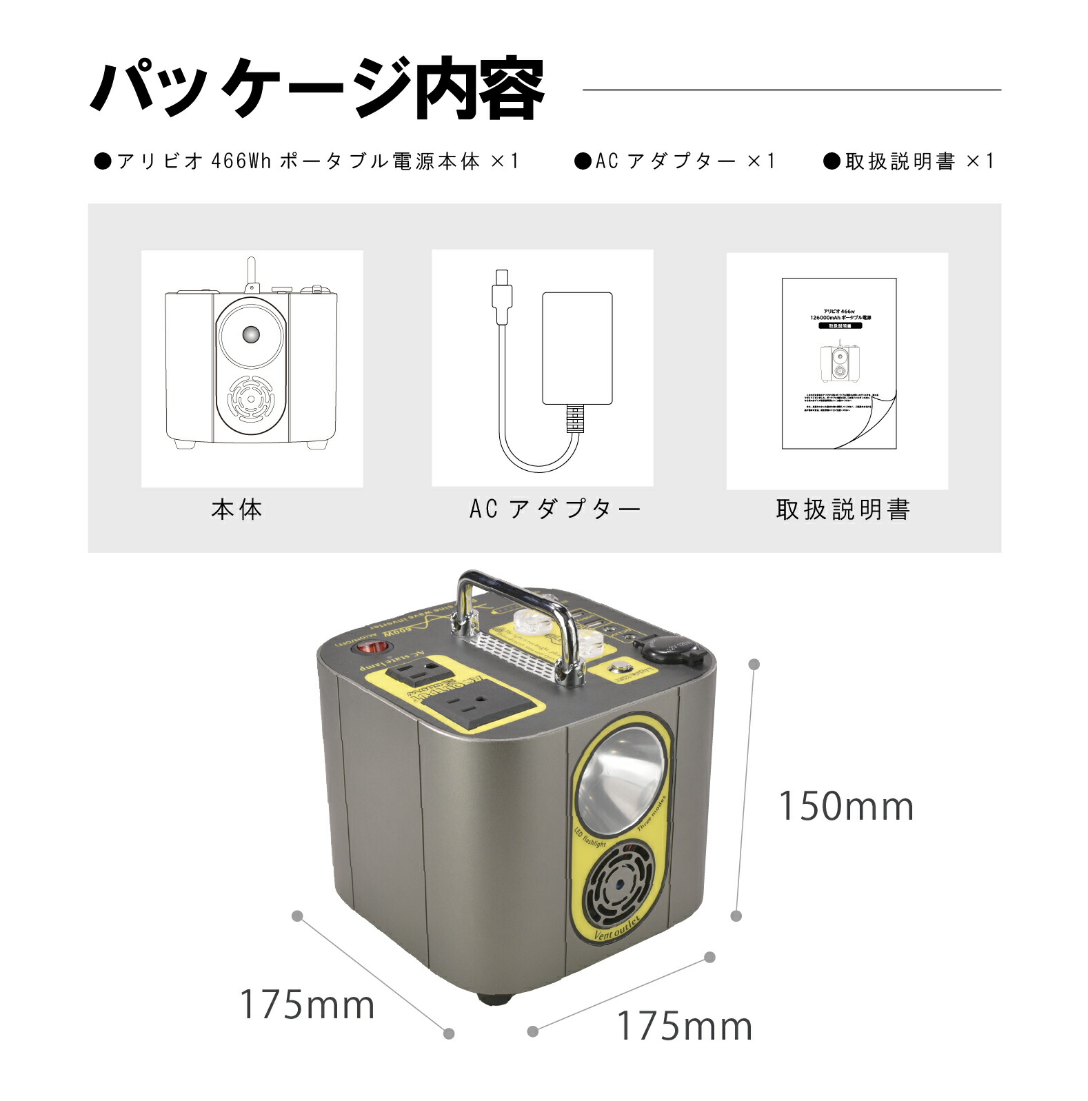 アリビオ466w ポータブル電源 大容量 バッテリー 126000mAh 466Wh アウトドア 蓄電池 小型 在宅勤務 100V 日本仕様 ジャンプスターター 車中泊 キャンプ 防災グッズ 停電 地震 3ヵ月保証 防災製品等推奨品 cyberplugs