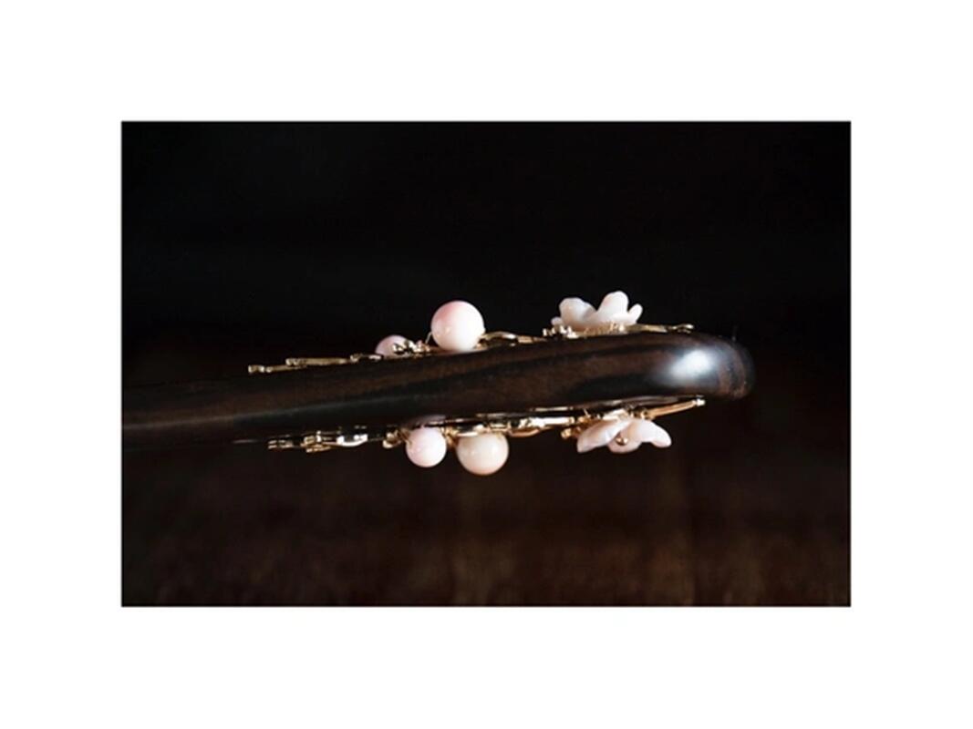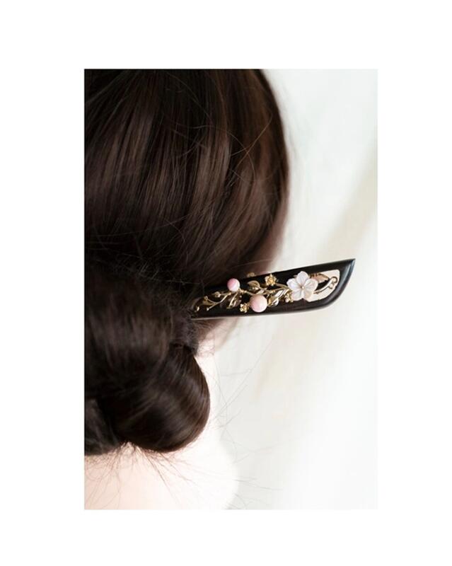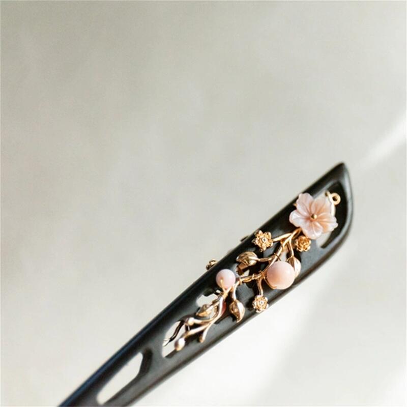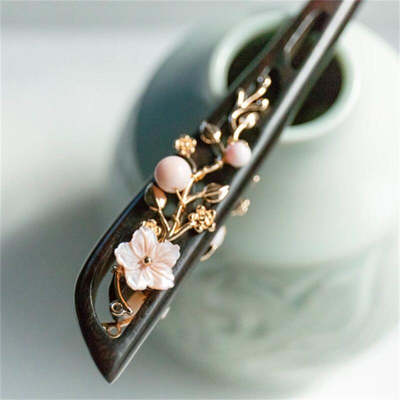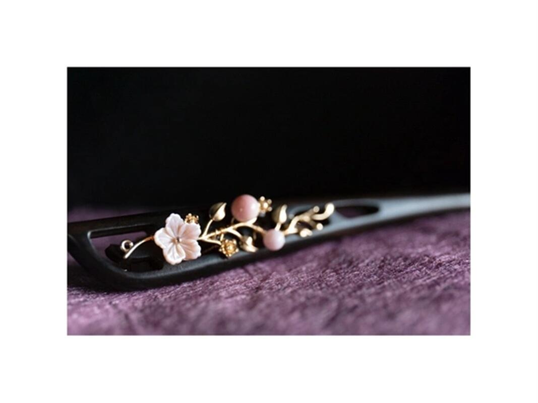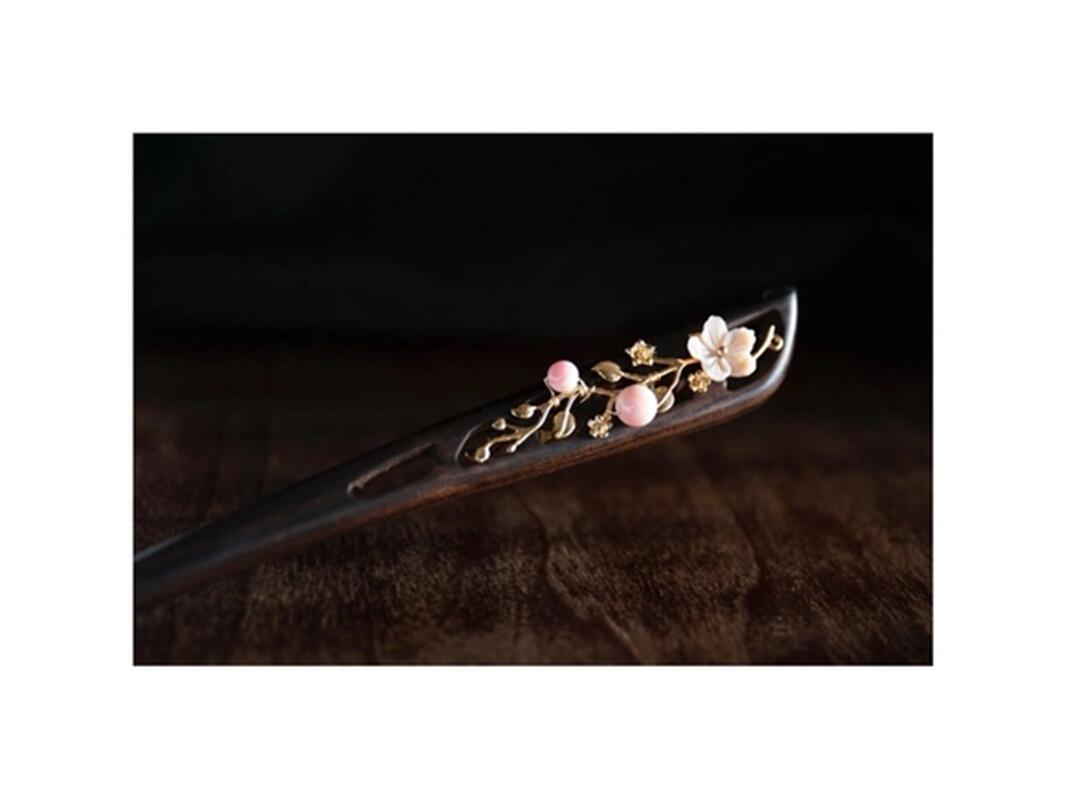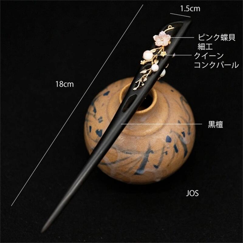 蝶貝細工花と高級シェルパールのかんざし 黒檀 両面飾り クイーンコンク 木製 簪 和装髪飾り