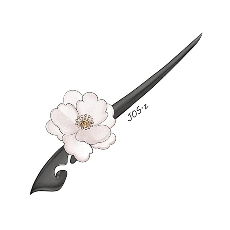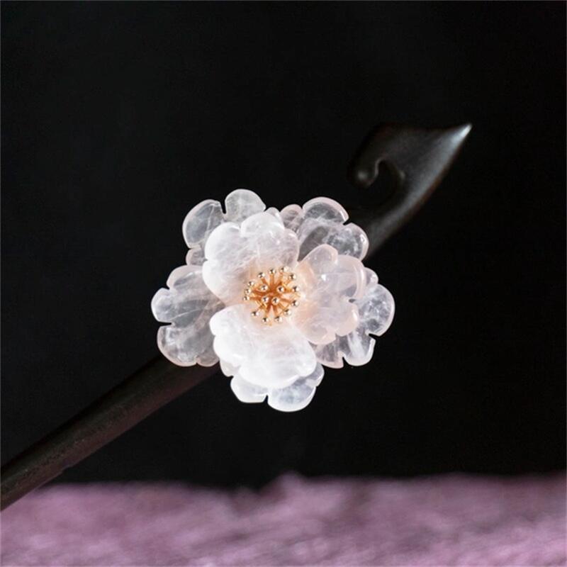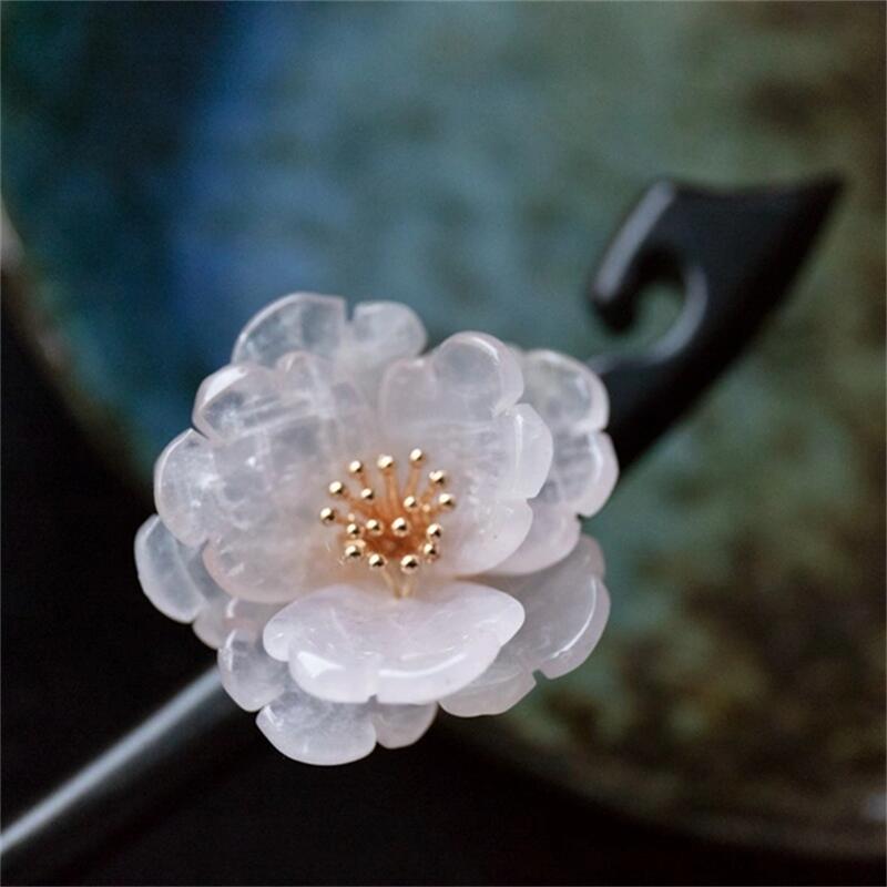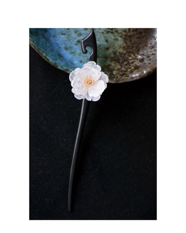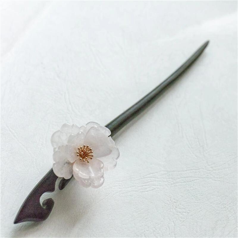 天然石ローズクォーツの牡丹のかんざし 檀木 黒檀 木製 簪