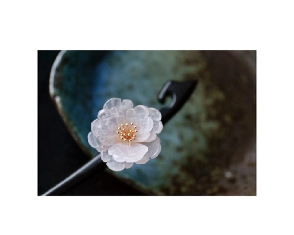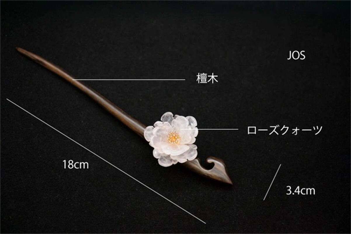ローズクォーツの牡丹のかんざし 檀 木製 簪 和装髪飾り